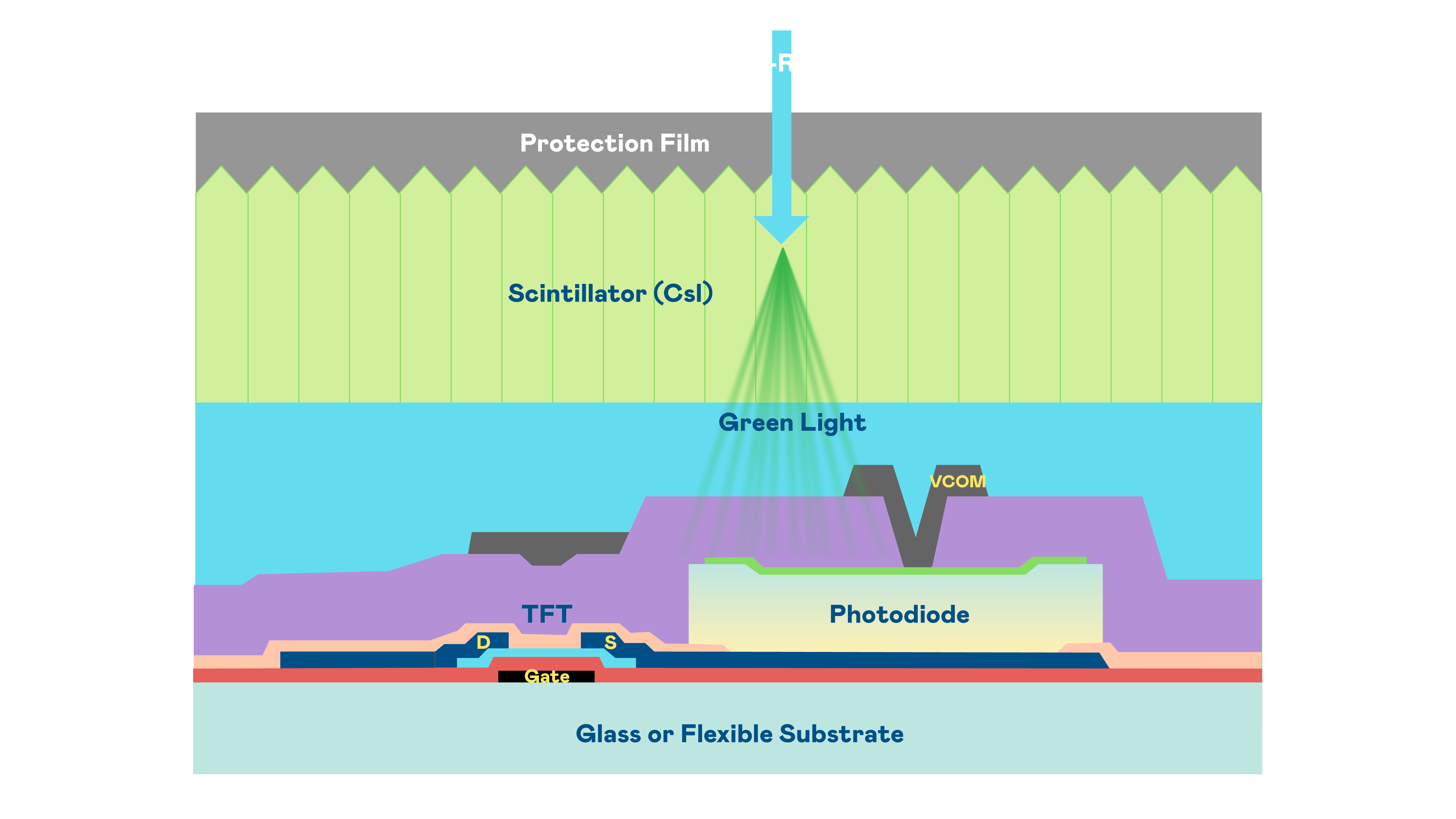 william威廉的X光影像感测阵列使用薄膜电晶体 (TFT) 作为每个像素的读取开关,搭配光电二极体(Photodiode)的光电转换元件,用以感测X光影像讯号。